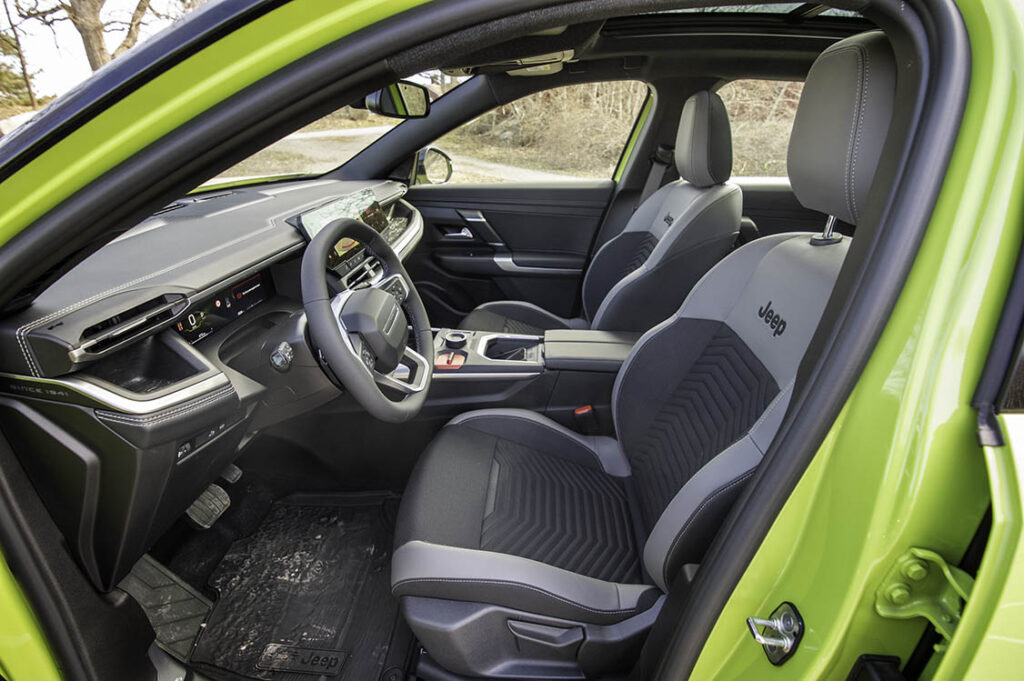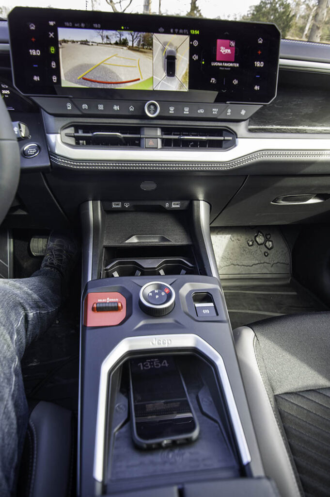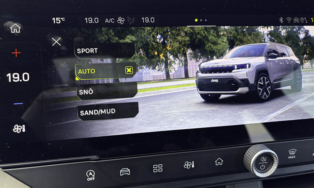 Det som tydligast gör den till en Jeep är grillen med Jeeps typiska sju stående rektanglar. Dessutom finns det en mjukvara där man kan välja att anpassa bilen för olika underlag som snö, sand eller för ”sportigare” körning. I det fallet så styrs gasrespons och växlingar för att ge bättre framkomlighet. En finess med marginell nytta. Särskilt för den som har lite erfarenhet.