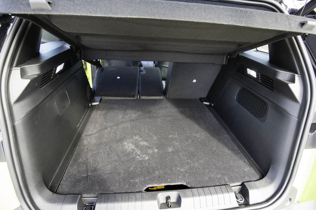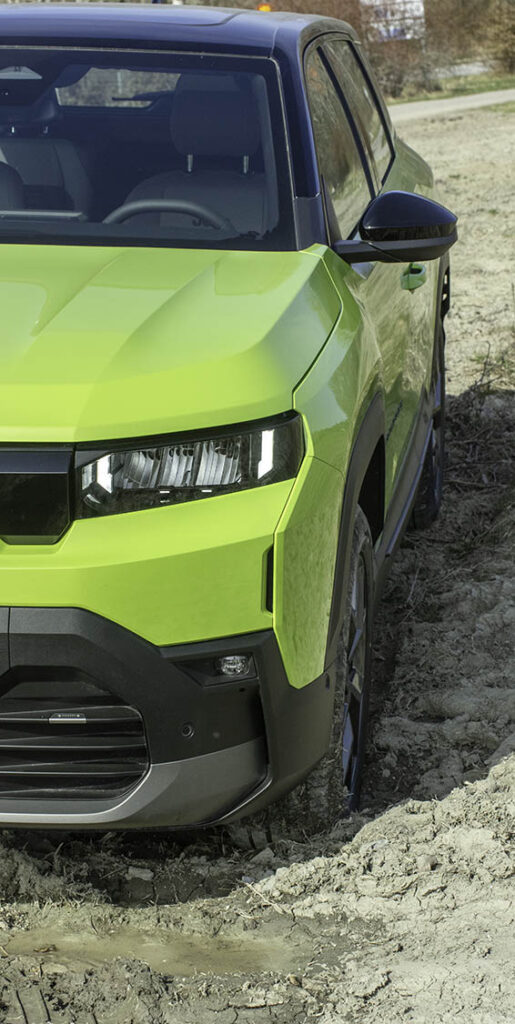 Det som gör den lite mer av en terrängbil är skyddet, i forma av hårdplastlister, runt hela bilen, kudden under drivlinan och batterierna samt de korta överhängen och en markfrigång på 20 cm.