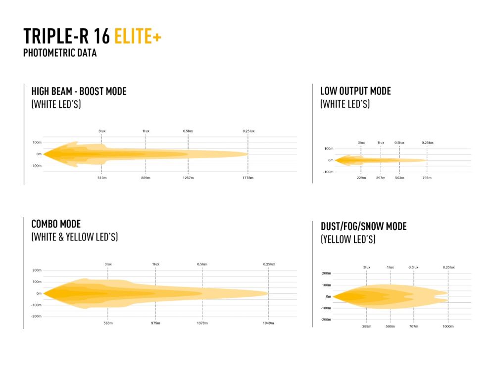 Lazer Triple-R 16 Elite+ har Lazers teknik för att växla mellan olika ljuslägena via en momentan strömbrytare. Ljuslägena är: Boost (endast vit), Combo (vit + gul), Snö/Dimma/Damm-läge (endast gul) och Låg ljusstyrka (endast vit vid reducerad ljusstyrka). En minnesfunktion i lampan innebär att det föregående valda läget aktiveras när fordonet startas om..